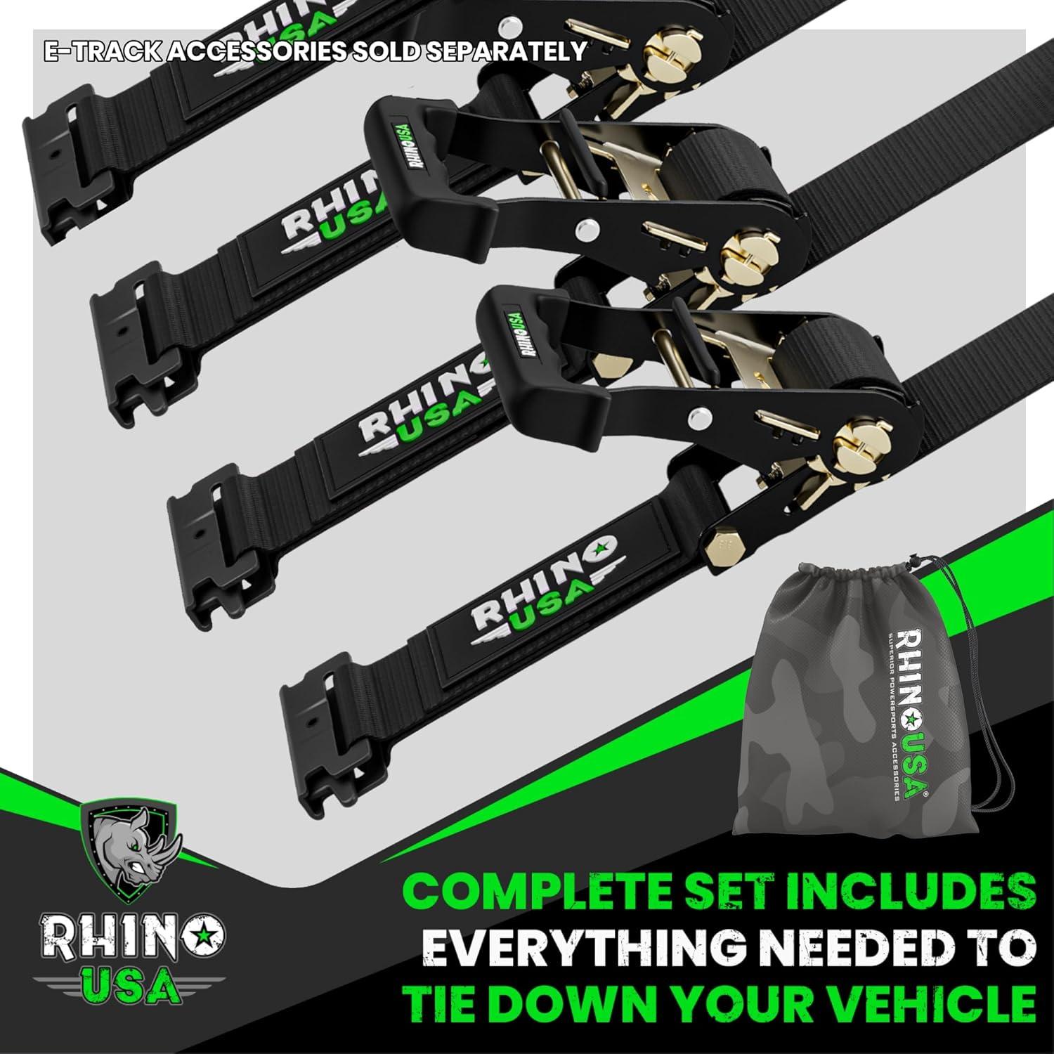 Rhino USA E Track Ratchet Tie Down Straps (4,500lb Break Strength) - Includes (2) Premium 2" x 16' eTrack Tie Downs - Ultimate Heavy Duty eTrack Cargo Strap System for Trailer, Truck, Motorcycle(Black)