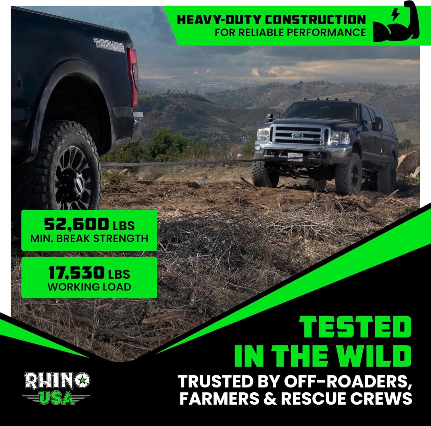 HEAVY DUTY: 1 inch 30 foot rope with a maximum breaking strength of 33,600lbs, capable of recovering and towing a Jeep, ATV, Tractor, Truck, and more.