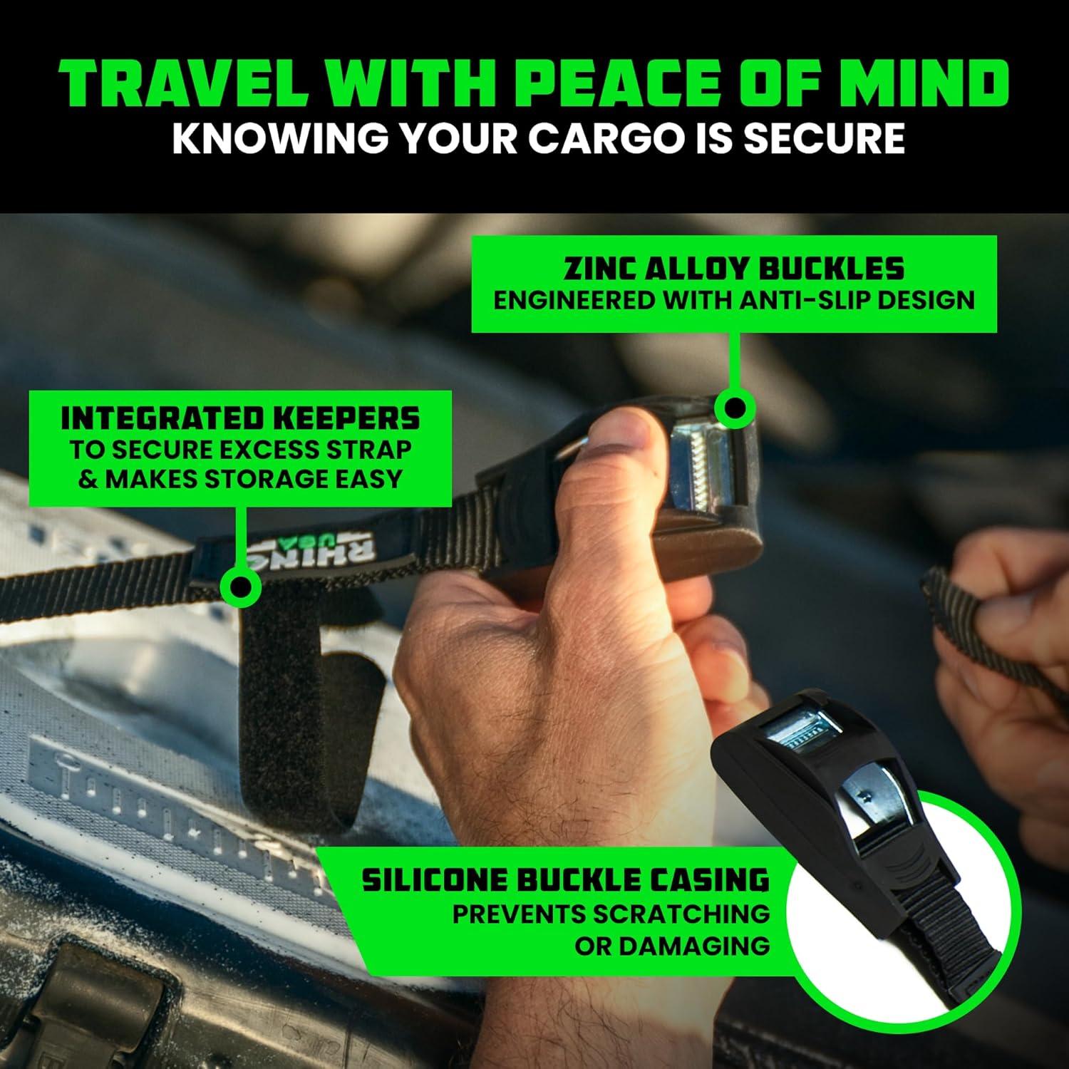imageRhino USA Lashing Straps Cargo Tie Downs 4PK  1320lb lab Inspected Max Break Strength Includes 4 Heavy Duty 1in x 12ft Cam Buckle Pull Straps Best for Kayak Cooler CargoBlack