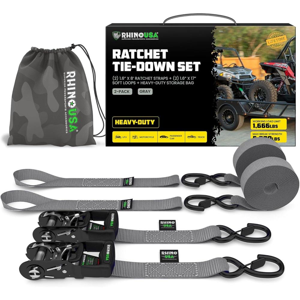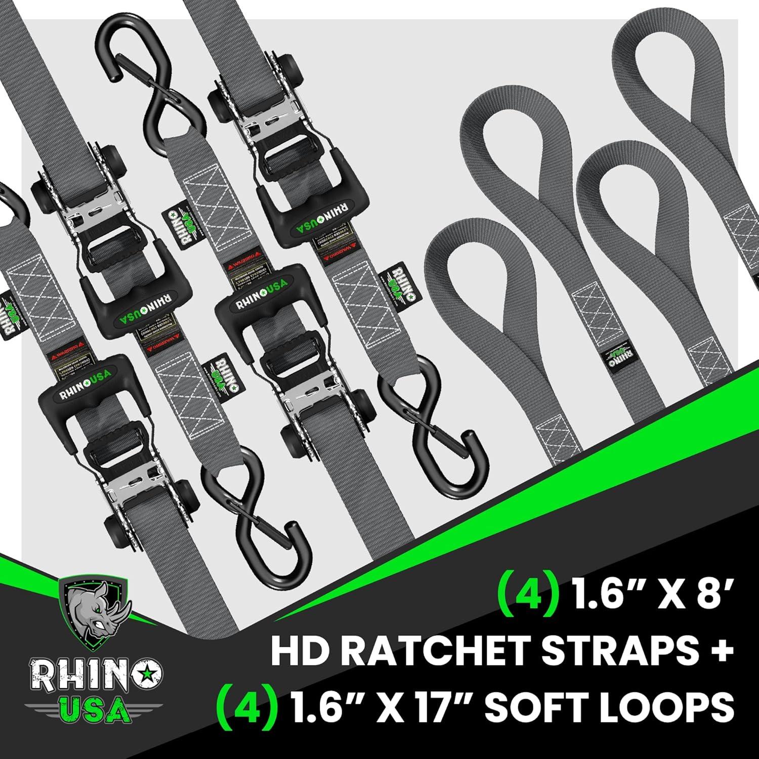 Rhino USA Ratchet Straps Heavy Duty Kit (2-Pack) – 1.6 Inch x 8 Feet (5,208lb Break Strength) – Ultimate Tie Down Straps with Safety S Hooks for Trucks, ATV, UTV, Motorcycle, Cargo & More – Green(Gray)