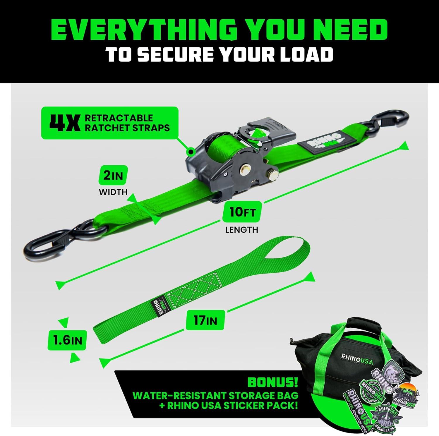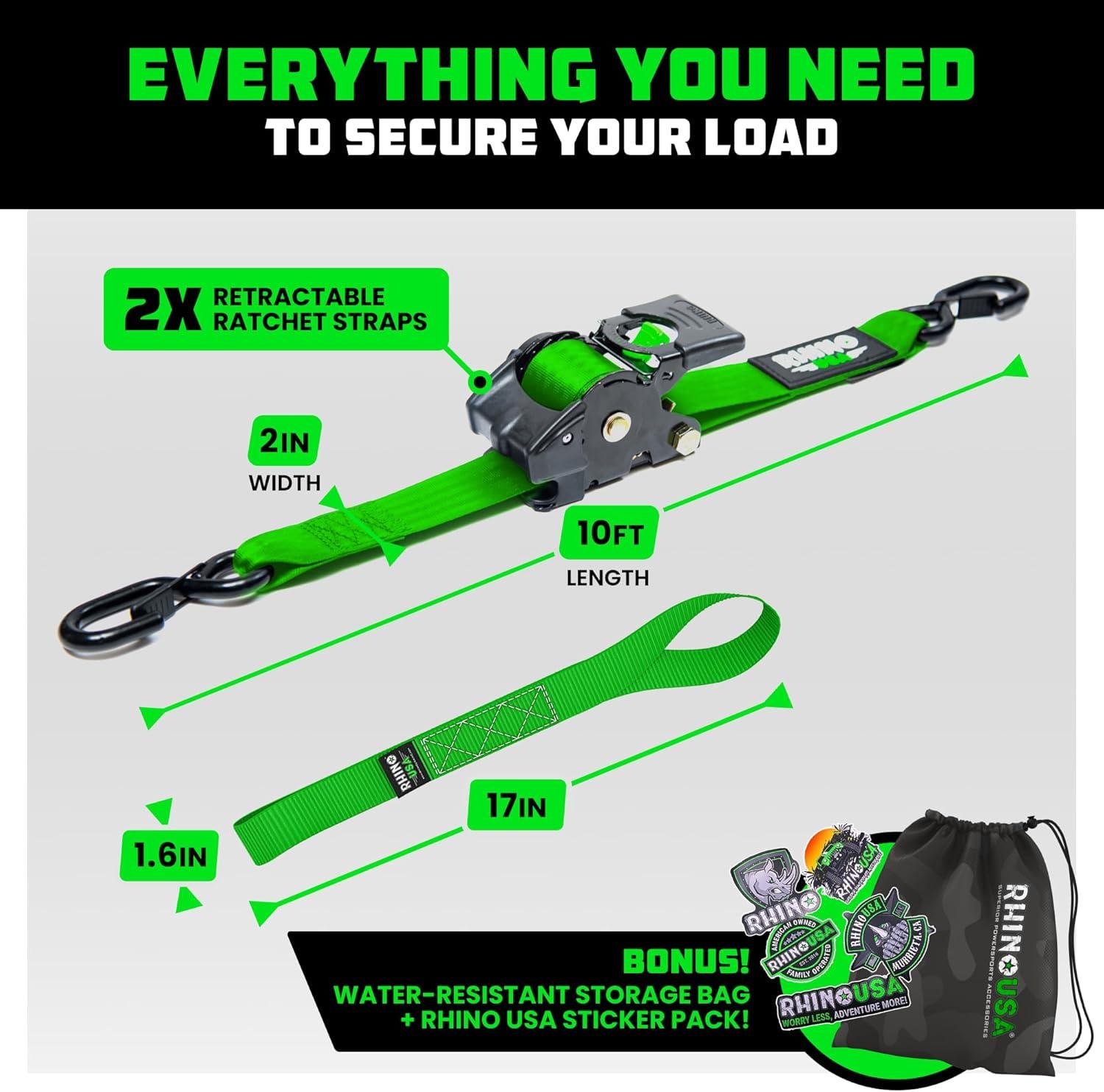 Rhino USA Retractable Ratchet Straps (2-Pack) - 2 Inch x 10 Feet (3,033lb Break Strength) - Heavy Duty Auto Self Retracting Tie Down Straps for Truck, Cargo Trailer, Motorcycle, Rad & More - Red(Green)
