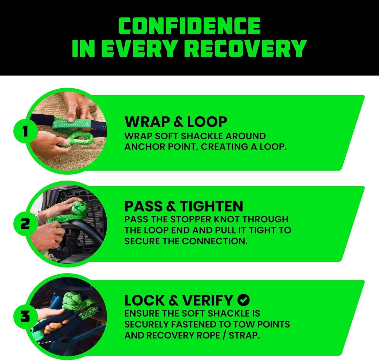 RECOVERY AS EASY AS 1-2-3 – Simply Loop the Soft Shackle Around the Recovery Point, Thread the end Through the Loop, and Tighten to Secure it for a Straightforward and Effective Recovery Process.